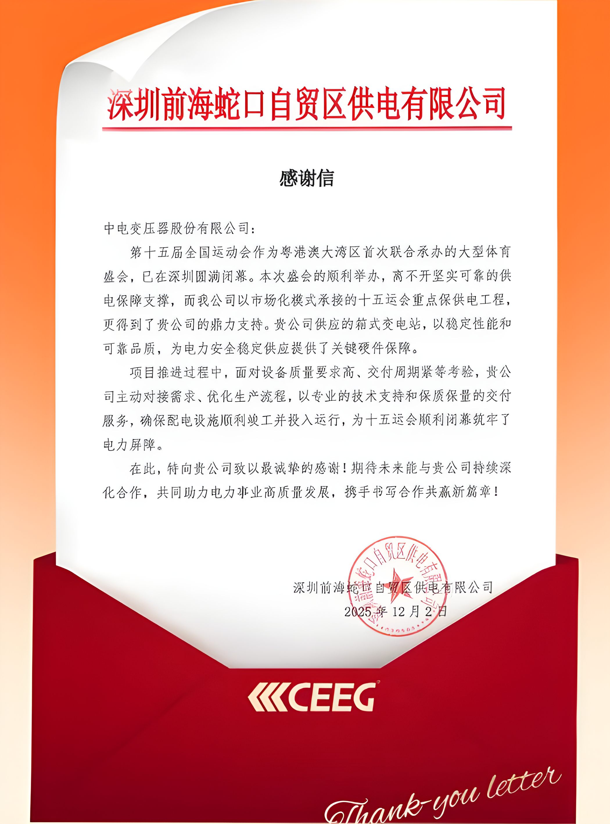 CEEG has been honored with a formal letter of appreciation for providing exceptional power supply solutions to multiple core venues during the recent National Games of China. Through the deployment of high-performance box-type substations, CEEG delivered complete power stability for one of the nation's most critical sporting events, ensuring zero interruption from start to finish.